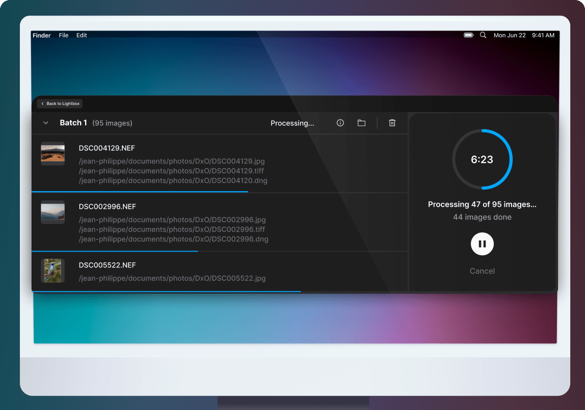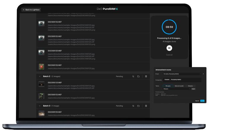 DxO PureRAW 6 accelerates high-volume processing with batch parallelization, intelligently launching the next file in the queue before the last one is finished. This maximizes hardware usage and dramatically reduces the time it takes to process large sets of RAW files, making demanding workflows faster, smoother, and more responsive.